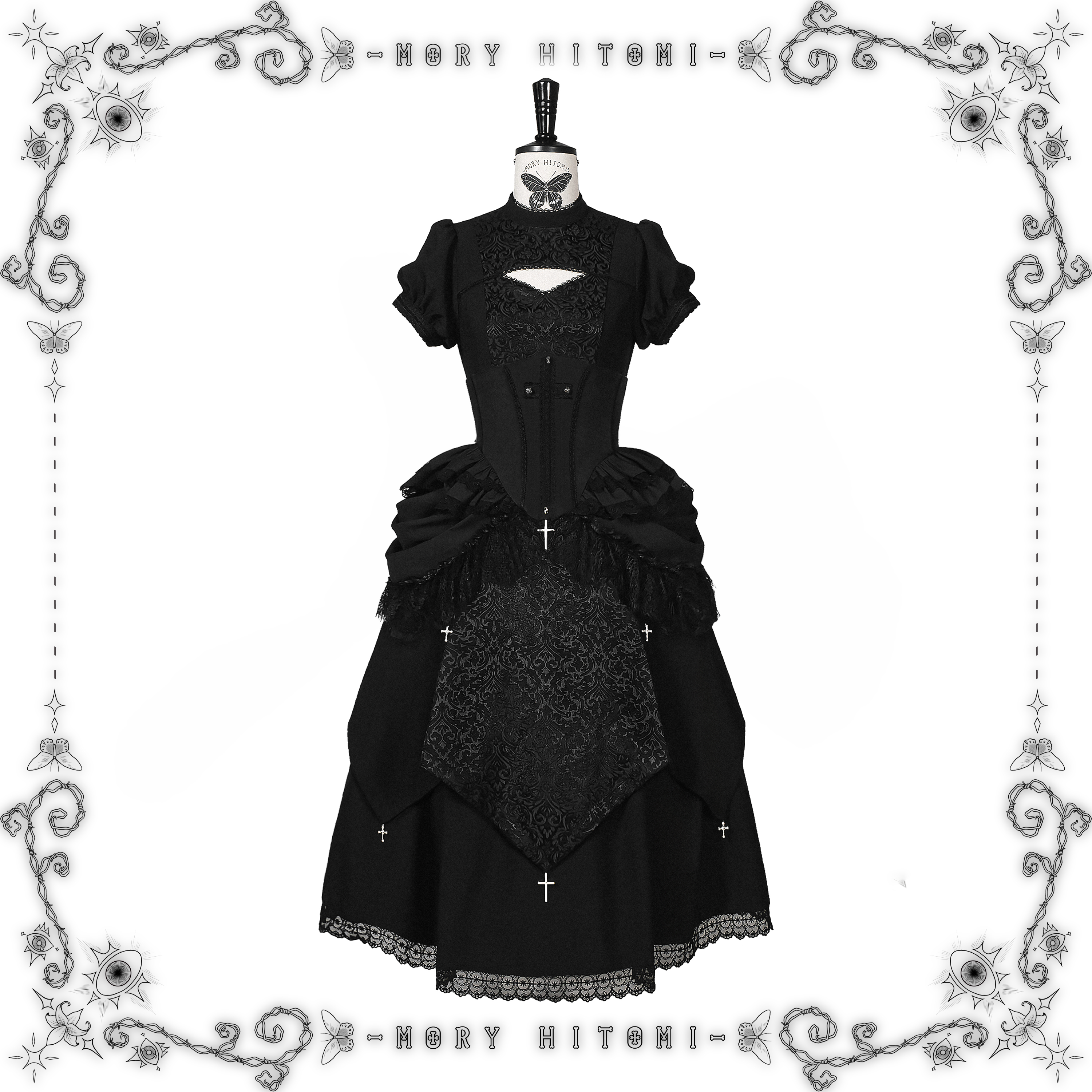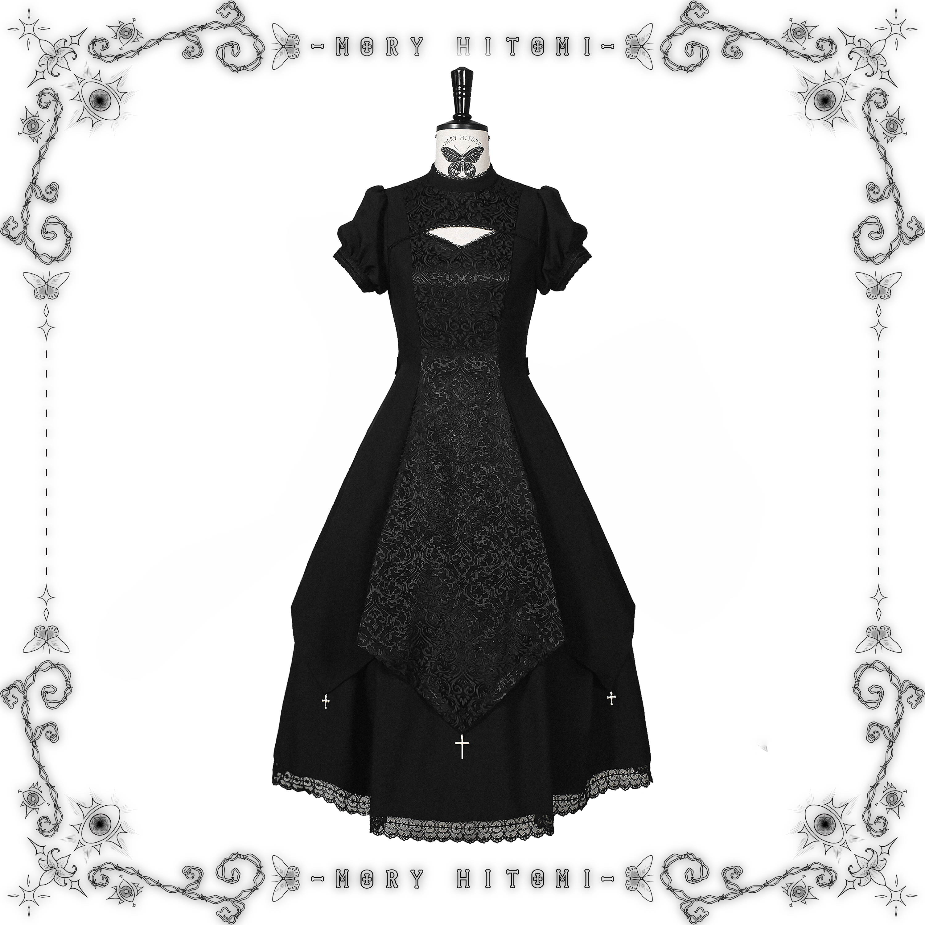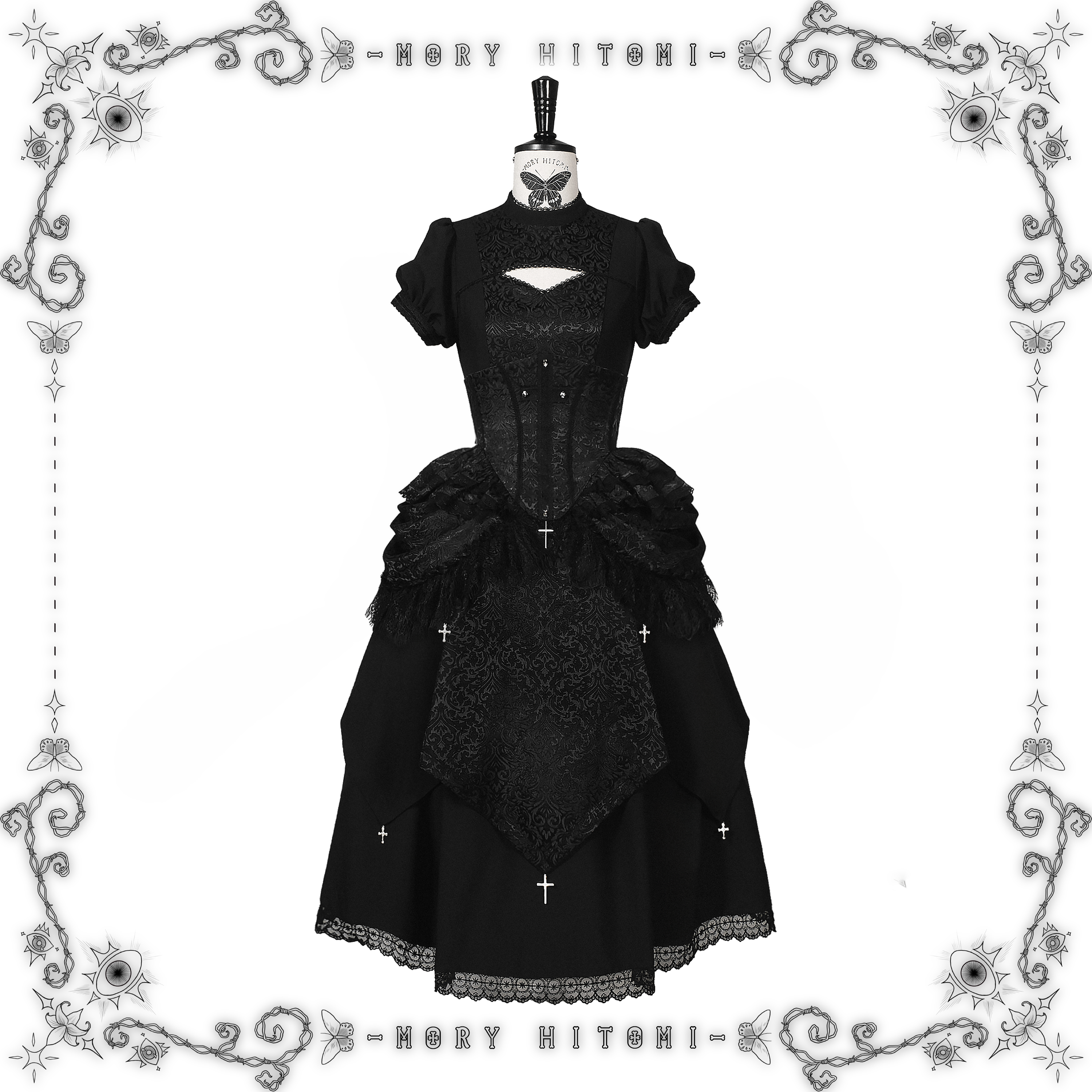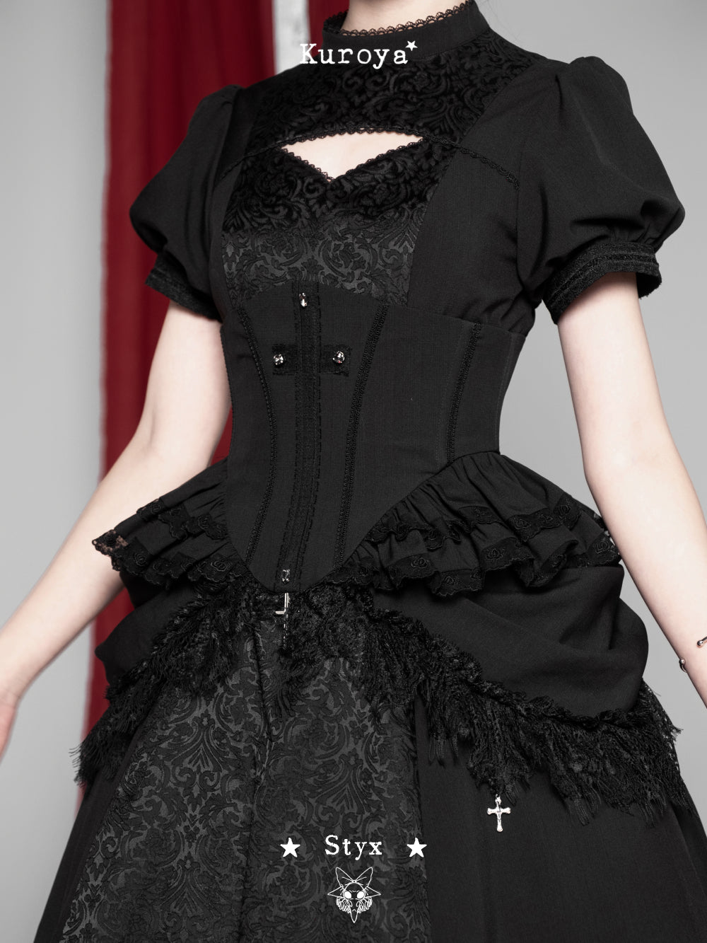 Materials: Faux linen / Dark jacquard / Eyelash lace / Water soluble lace / Crescent lace / Metal cross pendants