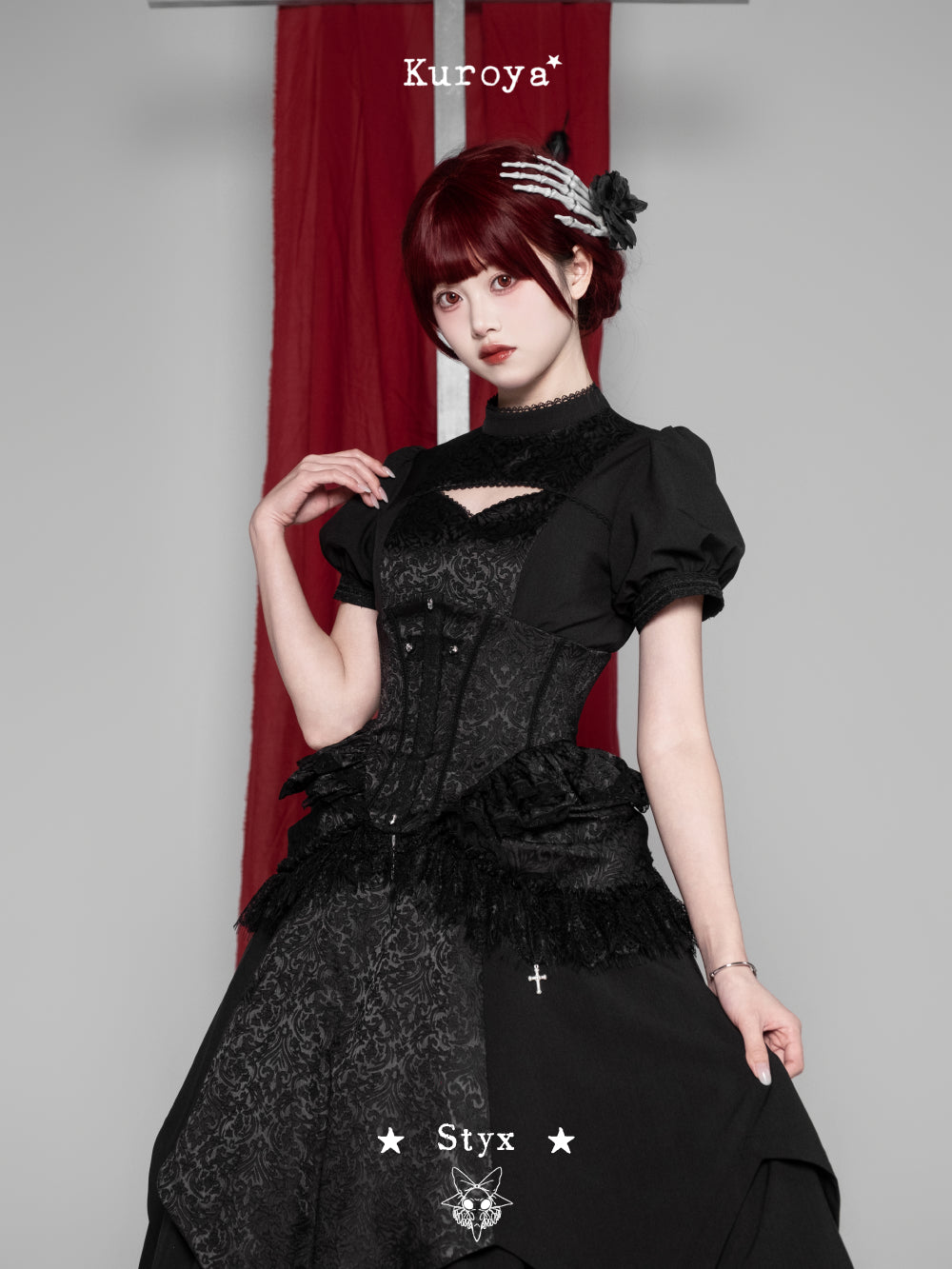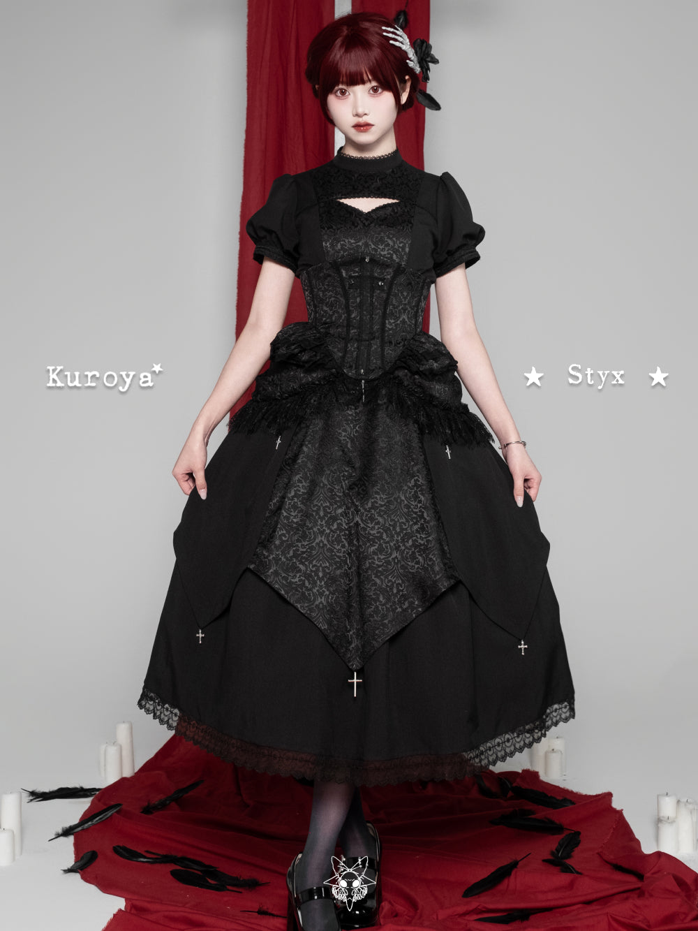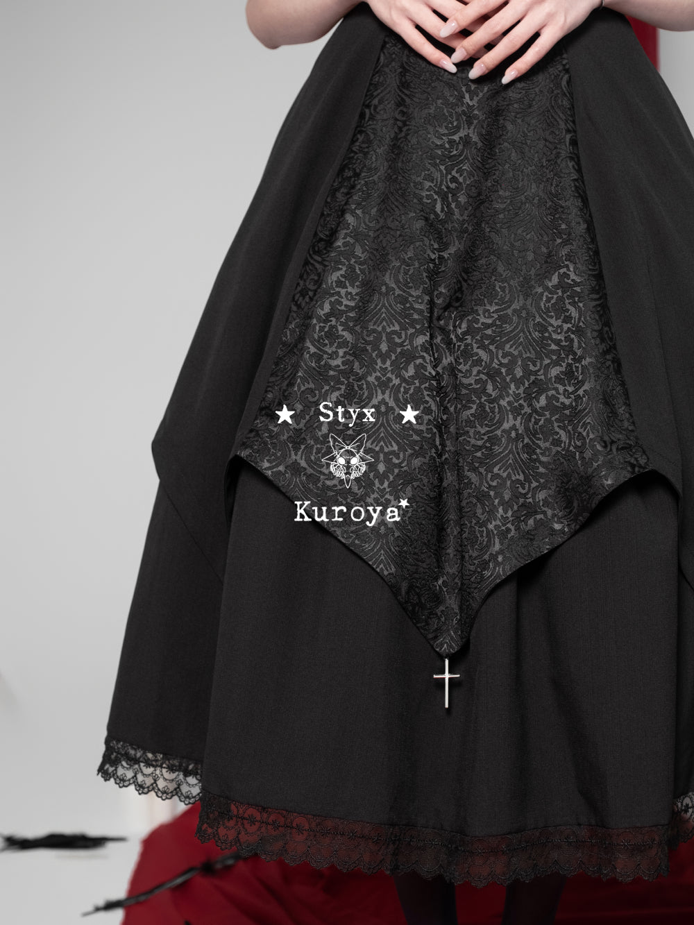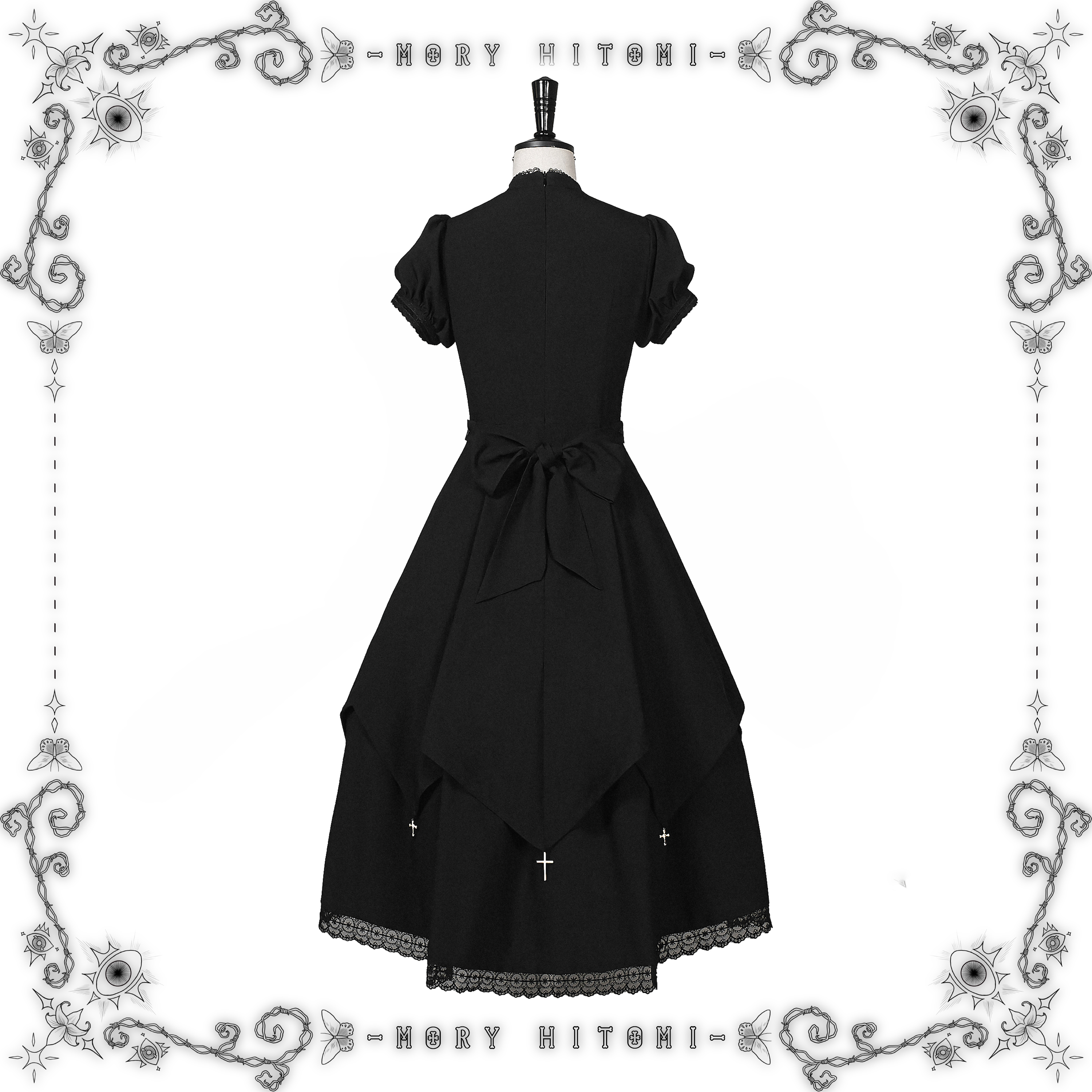 Materials: Faux linen / Dark jacquard / Eyelash lace / Water soluble lace / Crescent lace / Metal cross pendants